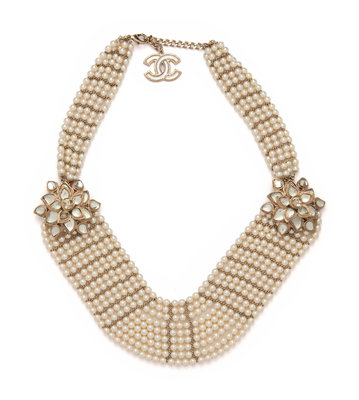 Large 9 strand faux pearl statement necklace adorned with flowers on either side, each featuring a small double C emblem, and a large double C pendant at closure. From the Fall 2012 Collection.