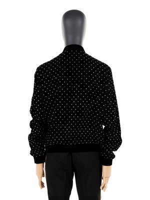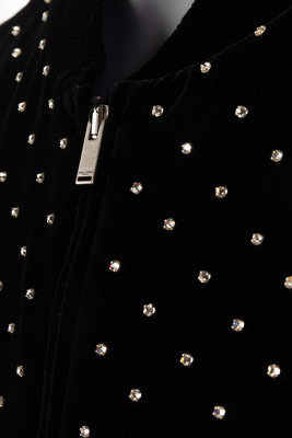 Black viscose blend velvet bomber jacket with clear rhinestones throughout, ribbed collar, cuffs, and hemline, and center front zipper closure.