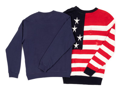 Linen distressed USA Flag sweater with pewter toned buttons on left shoulder.