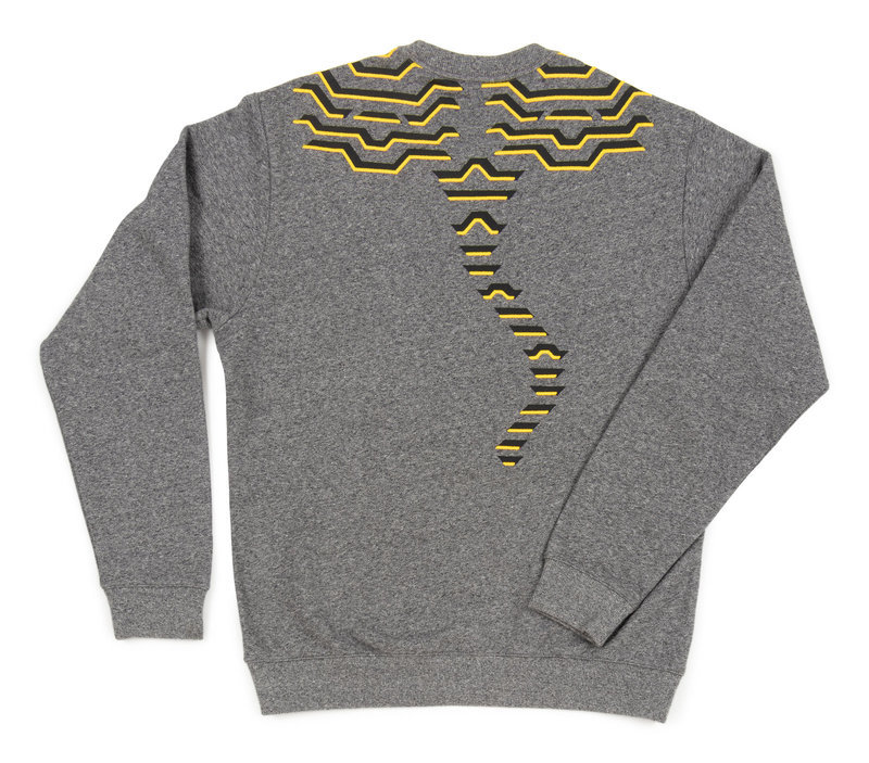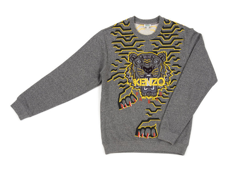 Heather gray cotton French Terry sweatshirt with yellow and black stylized tiger embroidery on the front and back.