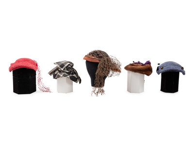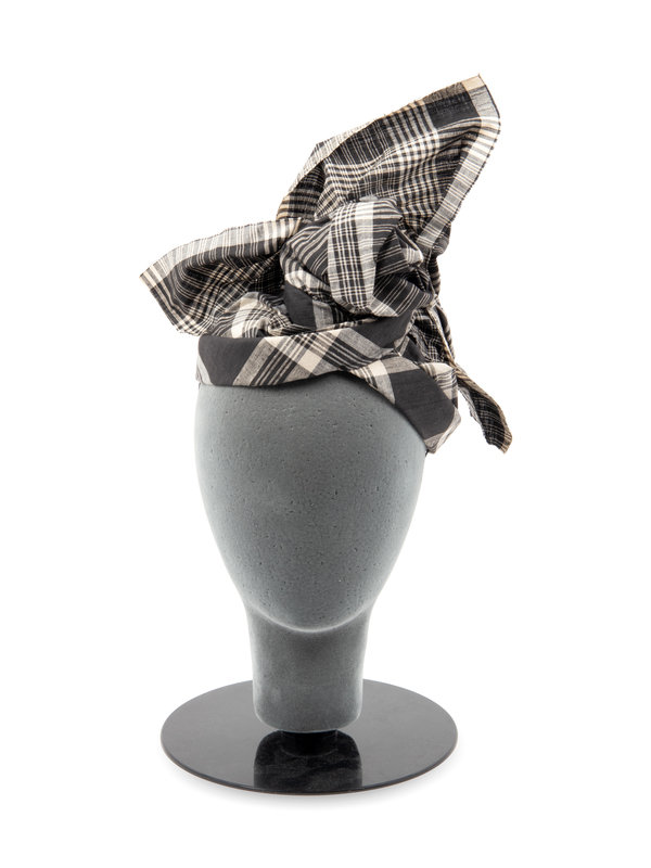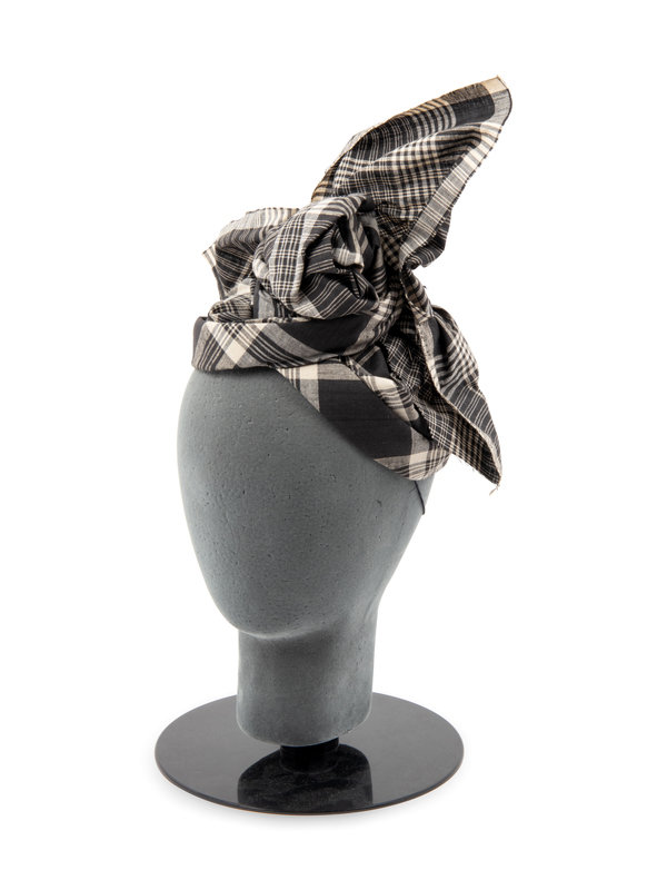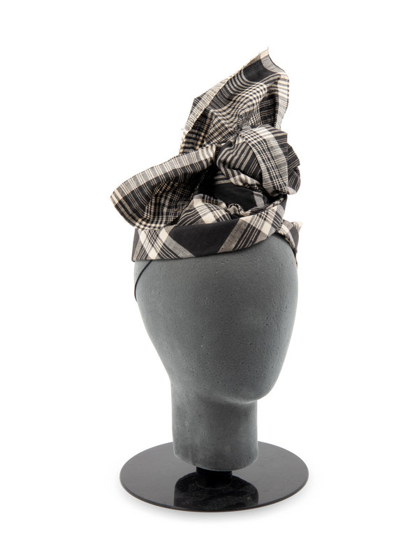 Black and white plaid hat wrapped into a loose knot on the top of the crown. The hat is underlined with paper to provide shape. The hat is dated to the 1940s, which suggests the use of paper was in place of more standard hat-making materials which were in short supply due to the restrictions of WWII.