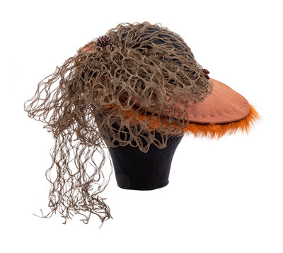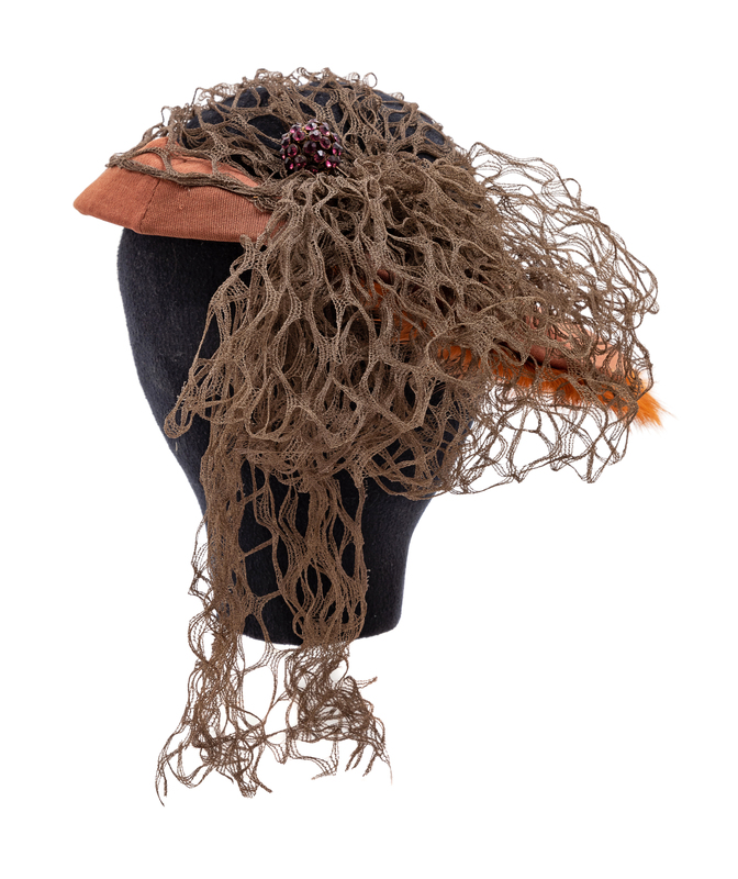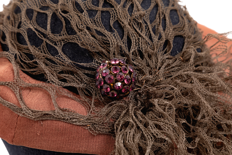 Brown knit hat made of a brim only, with the opening filled with a green/brown fishnet formed into large bow at center back. The underside of the brim is embellished with brown/red feathers. The hat has two hat pins secured into the brim.