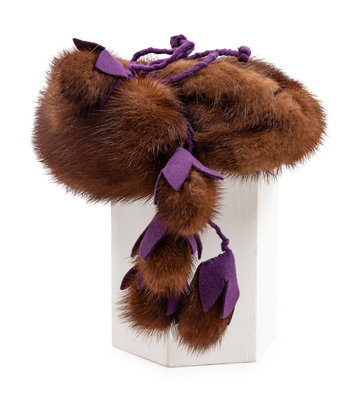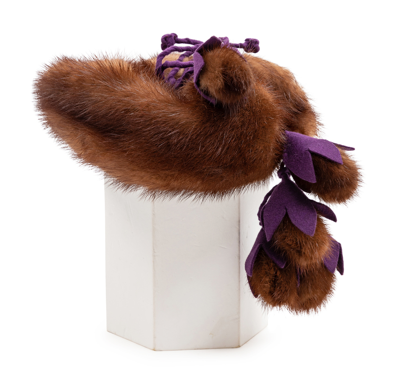 Small cap of brown mink gathered on the top of the crown and finished with purple felt bow and five felt and mink flowers on the right side.