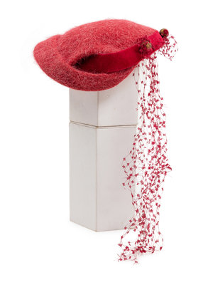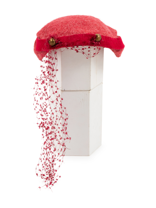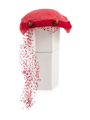 Red and white long hair felt trimmed with a band of red felt at the back hem and finished with two goldtone thread hat pins and a red veil.