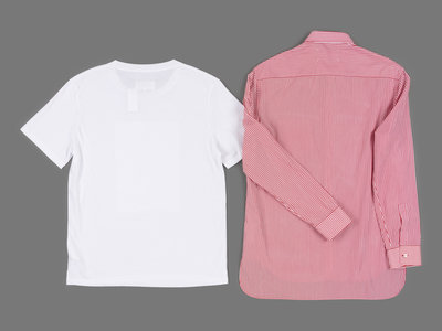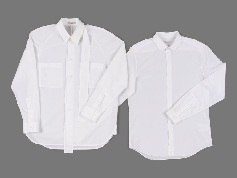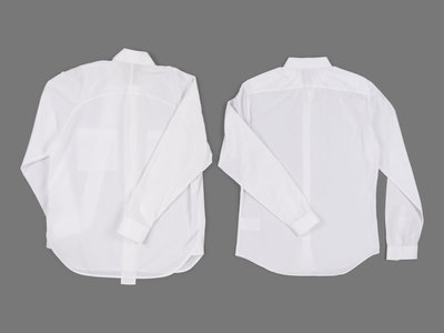 White cotton raglan sleeve, box-cut dress shirt with detachable strips.