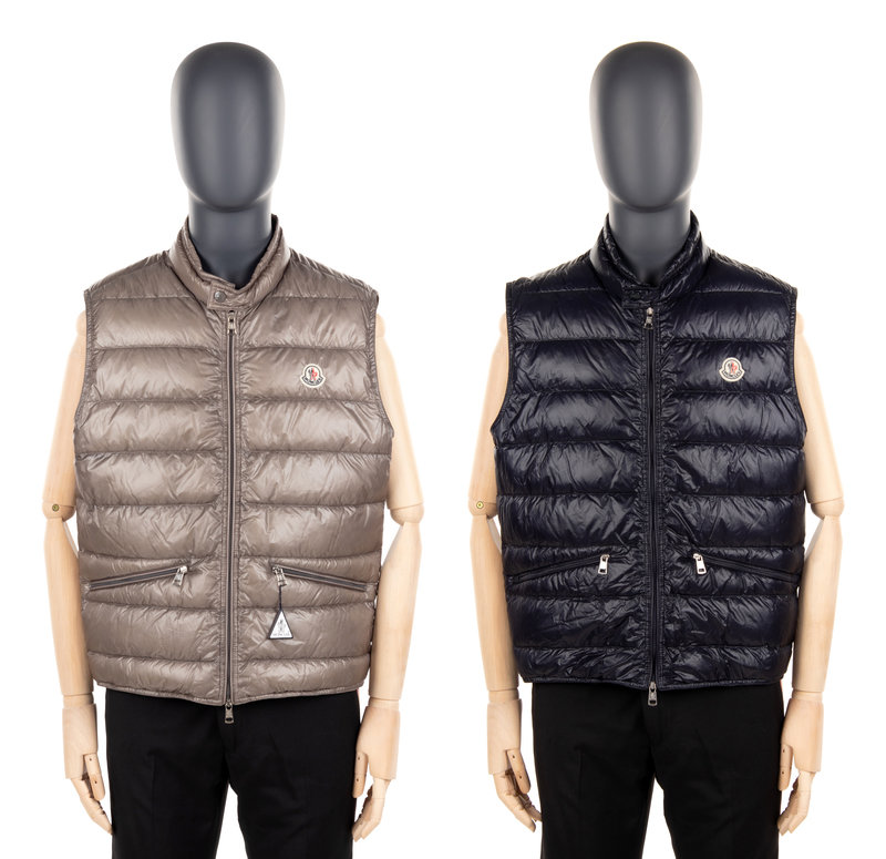 Gray polyamide filled goose down puff vest with center front zipper closure; cinch storage bag included.