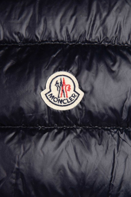 Dark blue polyamide filled goose down puff vest with center front zipper closure; cinch storage bag included.