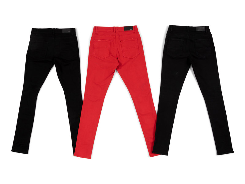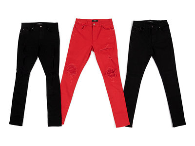 Red cotton blend slim cut distressed denim jeans with red leather knee patches.