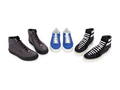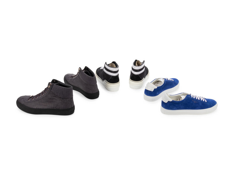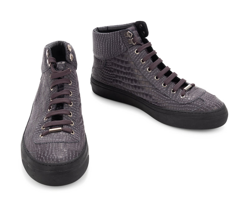 Gray and black emobssed leather to look like alligator high to sneakers with leather soles.