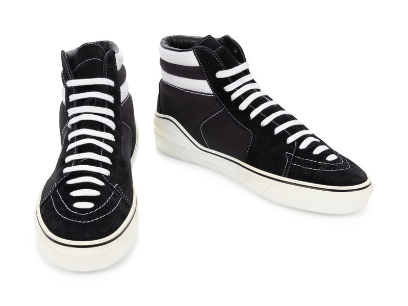 Black and white seude and canvas high top sneakers.