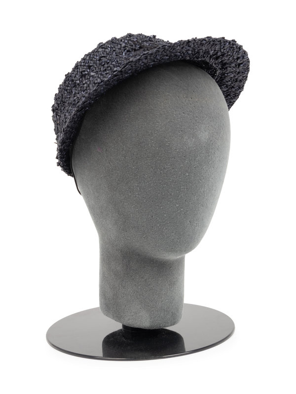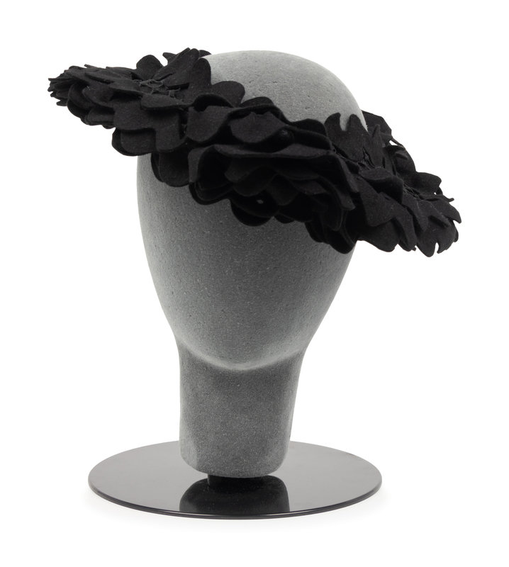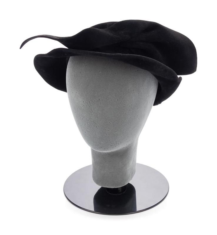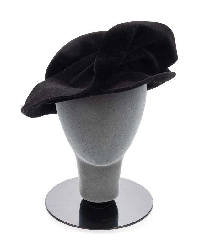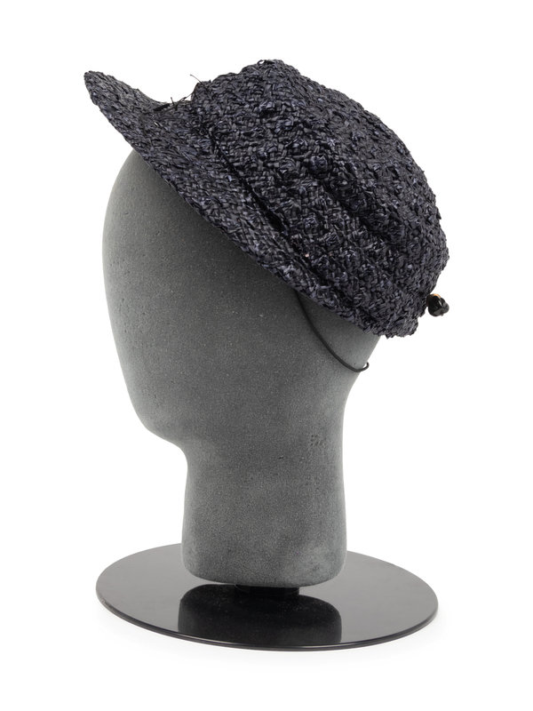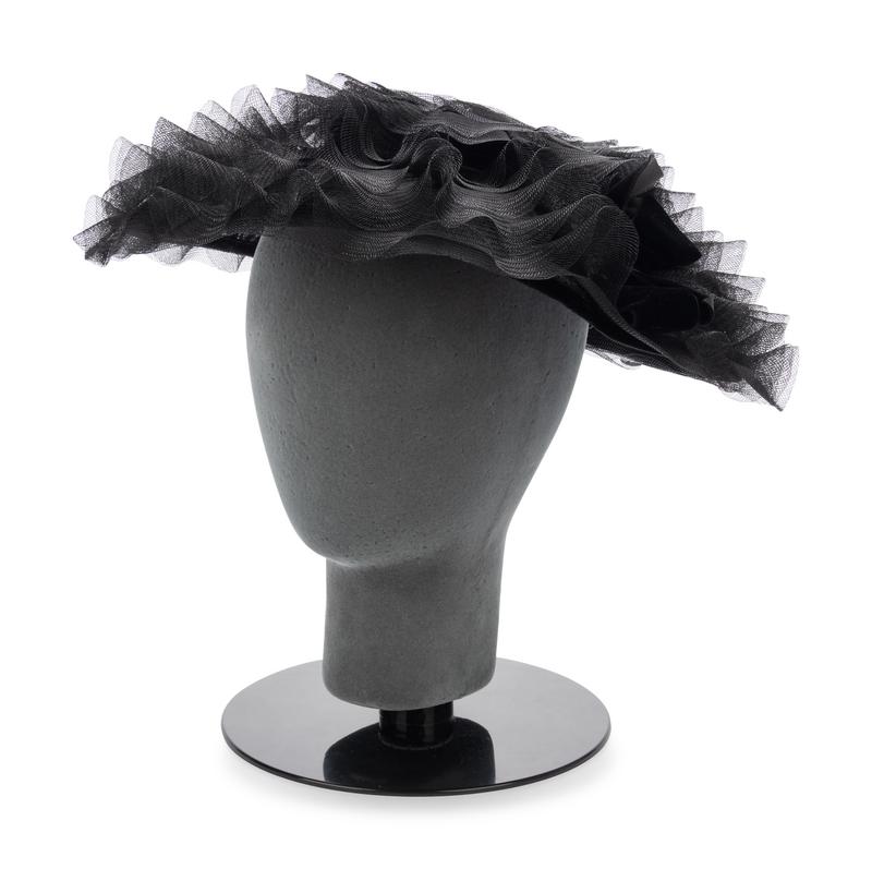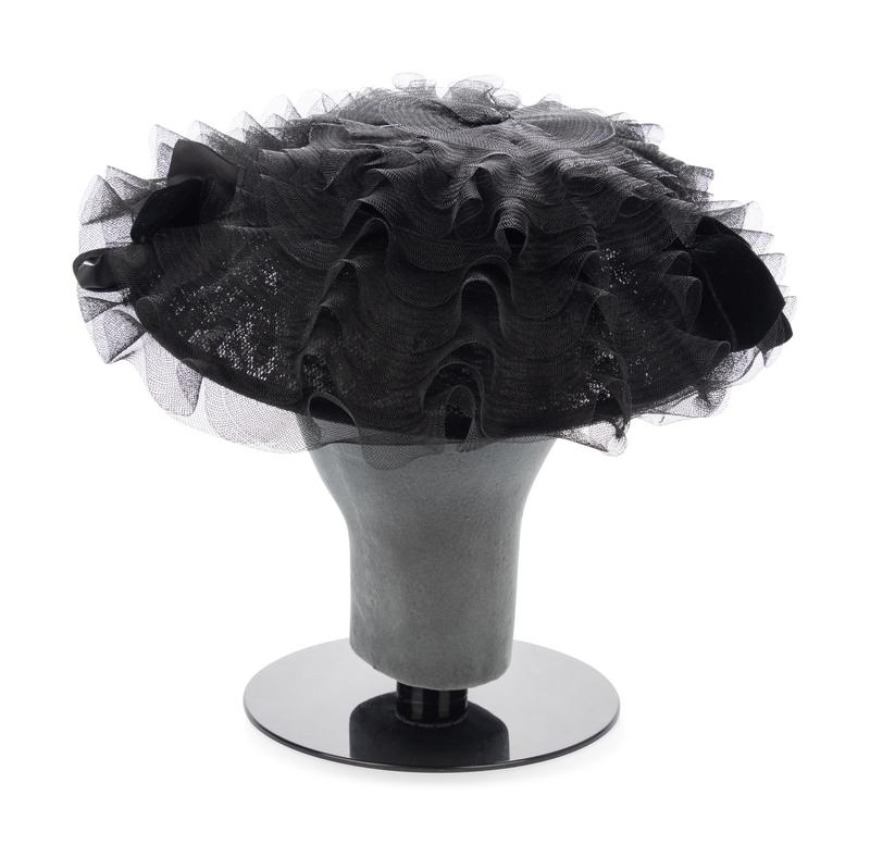 Black ruffled synthetic horsehair braid hat with black lace and velvet trim.