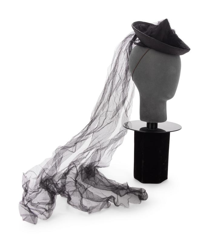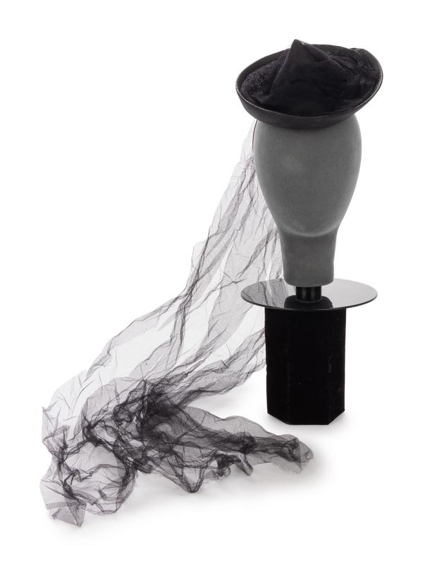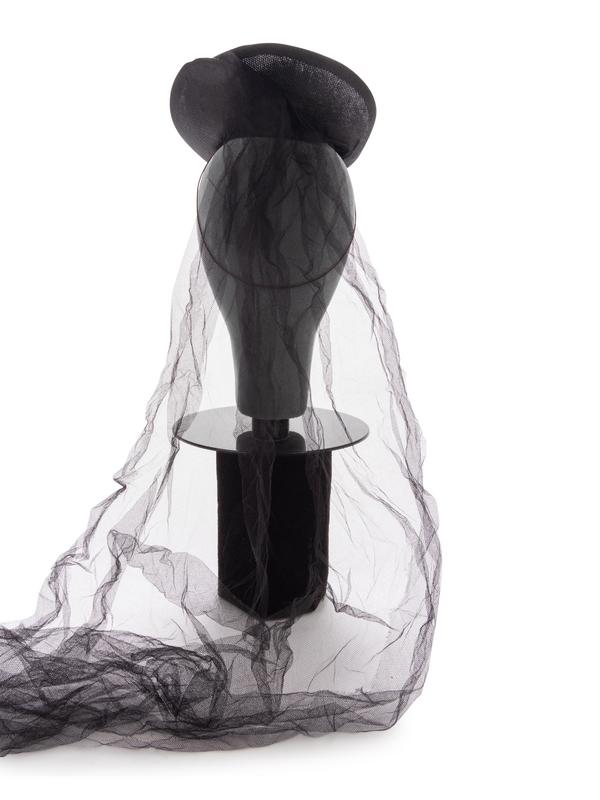 Black straw cone shaped hat with black net swirled on top and long black net drape.
