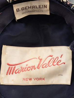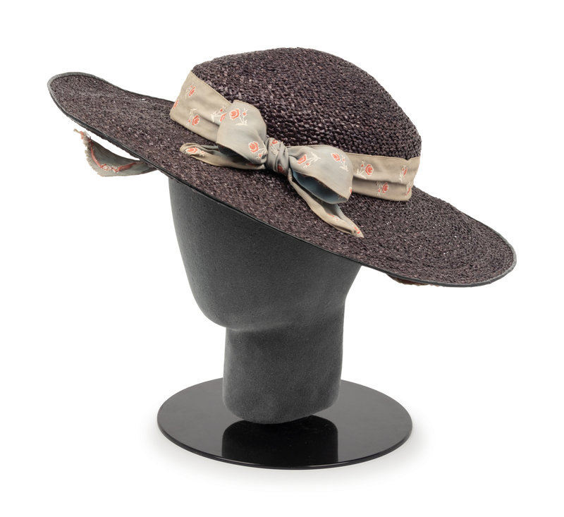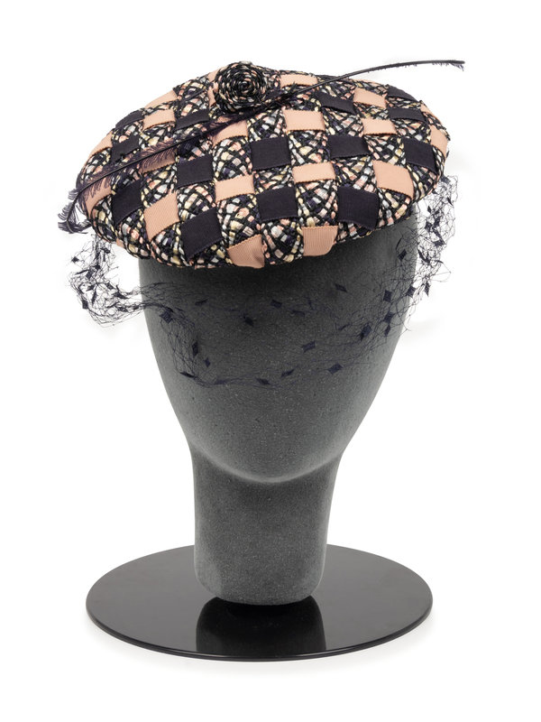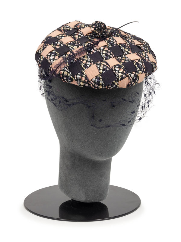 Pink and blue grosgrain ribbon and woven straw checkerboard hat with ostrich feather and blue net veil.