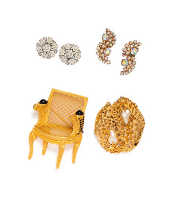 This lot includes a collection of costume jewelry; two pairs of earrings, two brooches.