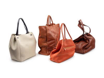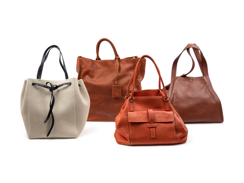 An orange leather bucket bag stitched with white thread with gold-tone hardware, lined with cream canvas.