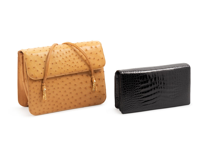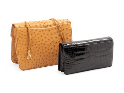 Two Judith Leiber Bags; One Black Crocodile Bag, One Tan Ostrich Bag, 1990-2000s
