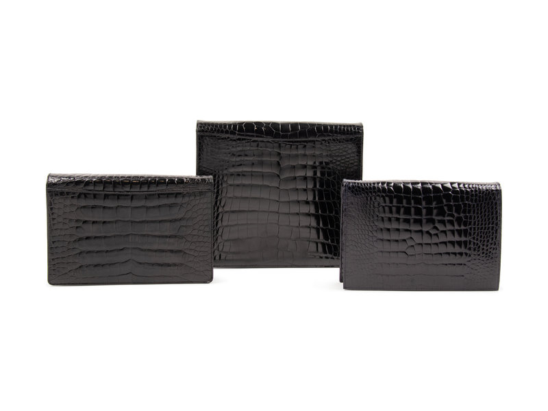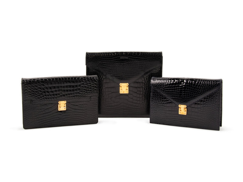 Large black alligator clutch with angled front flap, trimmed with gold-tone hardware, lined with black leather, with removable black alligator strap