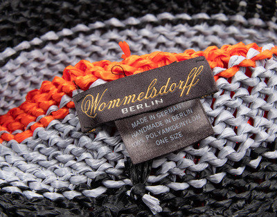 A Wommelsdorff hat of nylon in colorful stripes of blue, black, and red, trimmed with self-fabric brim.