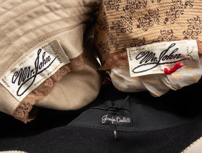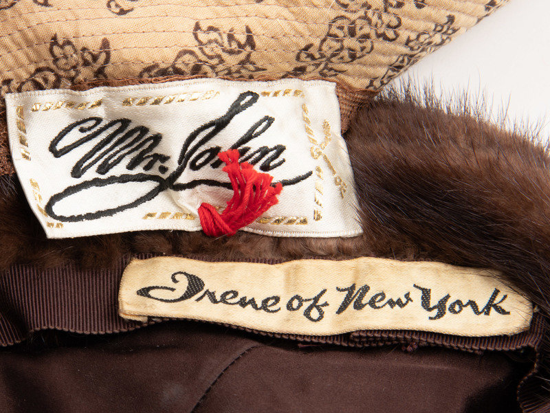 A hat and matching scarf set of tan fabric printed with a brown floral scene. Mr. John hat has a wide brim, lined with white fabric printed with the words Mr. John