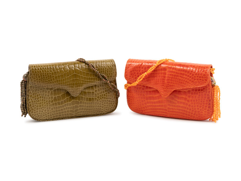 A orange single pocket, front flap, with goldtone hardware, lined with tan leather, removable enameled goldtone tassle, and two removable straps one of beads and one of orange alligator.