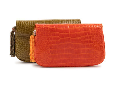 A green single pocket, front flap, with goldtone hardware, lined with tan leather, removable bead tassle, and two removable straps one of beads and one of green alligator.