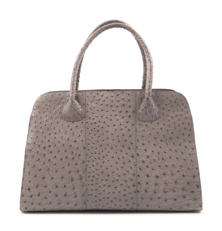 A gray Nancy Gonzales ostrich hand bag, lined with light blue suede, with two pocket interior.
