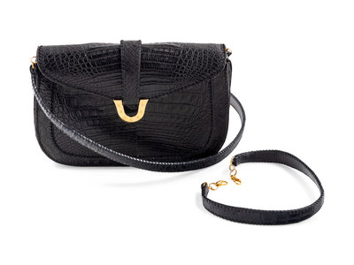 Lana Marks Black Alligator Clutch, with top stitching trimmed with gold-tone hardware, lined with black leather, two detachable straps.