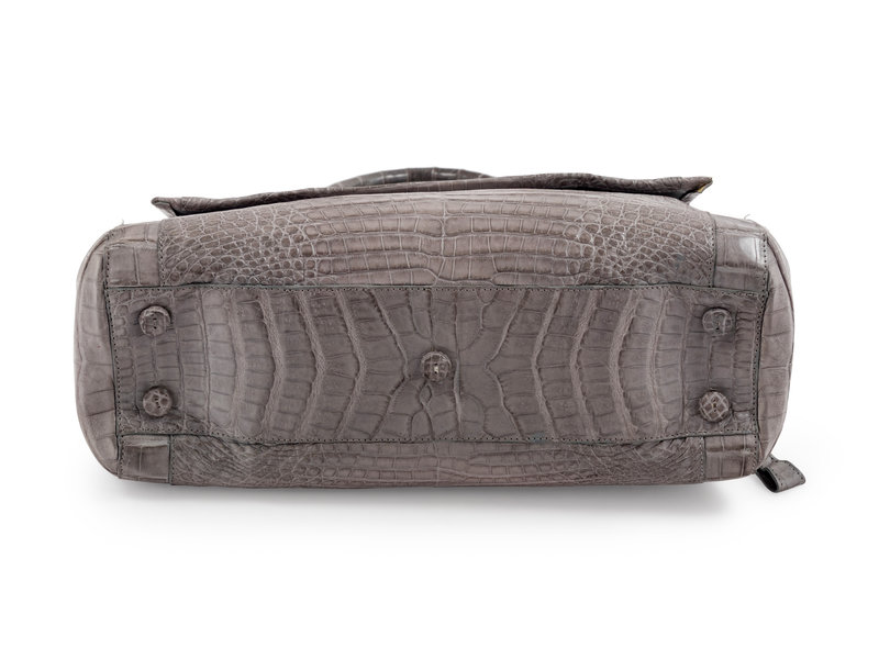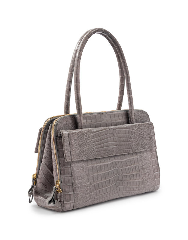 A gray crocodile handbag with multiple pockets, lined with gray suede, trimmed with gold-tone hardware