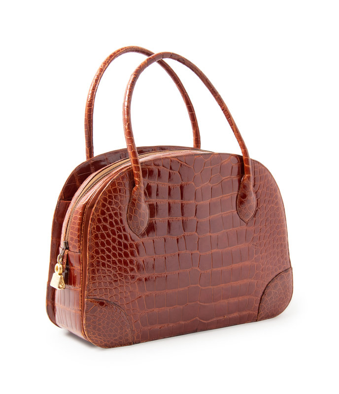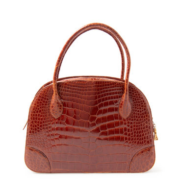 A brown patent alligator handbag, with a 3 pocket interior, with central pocket closed with a zip, lined with brown leather, and trimmed with gold-tone hardware including a gold-tone handbag zipper pulls. Detachable brown alligator strap.
