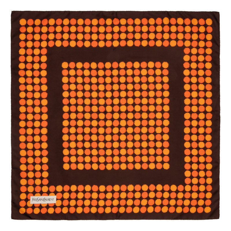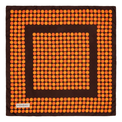 Brown, orange and yellow silk scarf printed with dot/flower pattern.