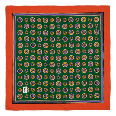 Green, orange and blue silk scarf printed with circular/flower pattern.