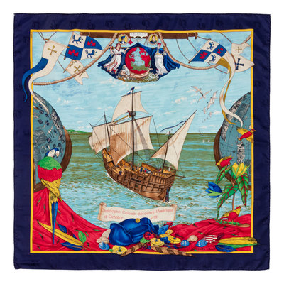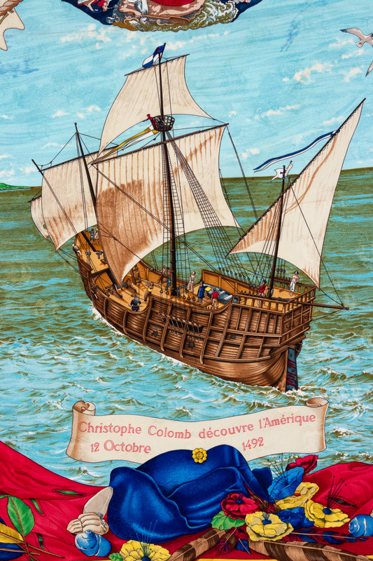 "Christope Colomb Decouvre l'Amerique" pattern on jacquard woven with a pattern of ships by Carl De Parcevaux. Year of issue, 1992.