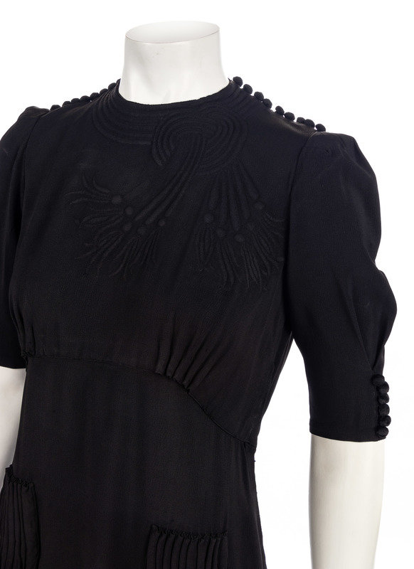 Black wool crepe jersey 1940s dress with quilted neckline, velvet button/loop shoulder closures, cartridge pleats under bust and at hips, and left side snap closure.