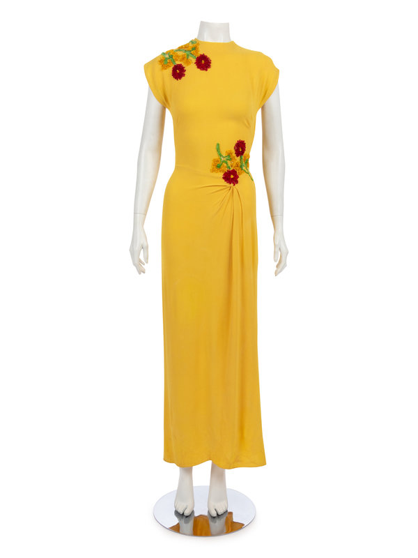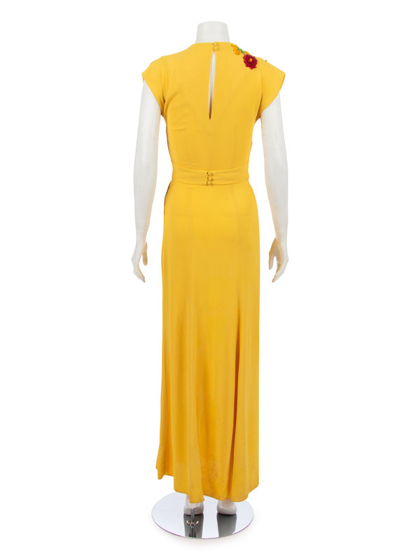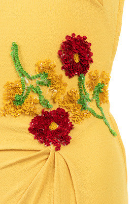 Bright yellow crepe evening dress with red, yellow, and green sequined floral motif, extended shoulder cap sleeves, bias draped skirt with sequined detail, and attached rear waist belt with buttons.