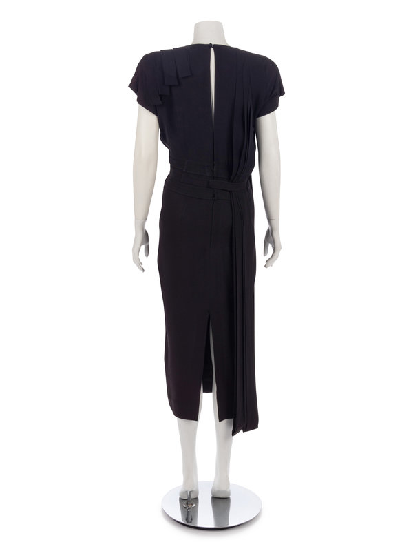 Black crepe short sleeve evening dress with draped bias-cut strips across a bloused bodice with a straight skirt with back slit. The bias bands start at the back left shoulder and drape over the front bodice to the right hip, before falling loose to the hem down the back/right side. The dress closes down the center back with a zipper at the waist/hips and a single button at the shoulder.