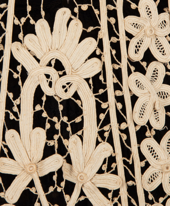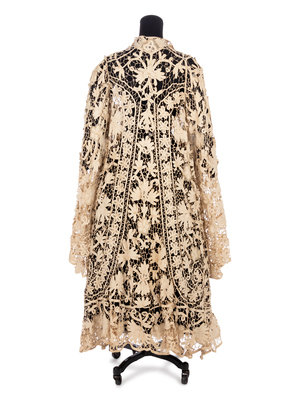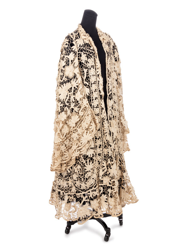 Edwardian tape lace evening jacket with a wide sweeping hem and long flared sleeves. The jacket has a stand collar and a center front opening with no closures.