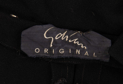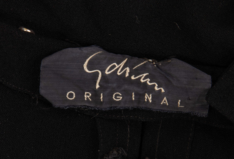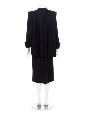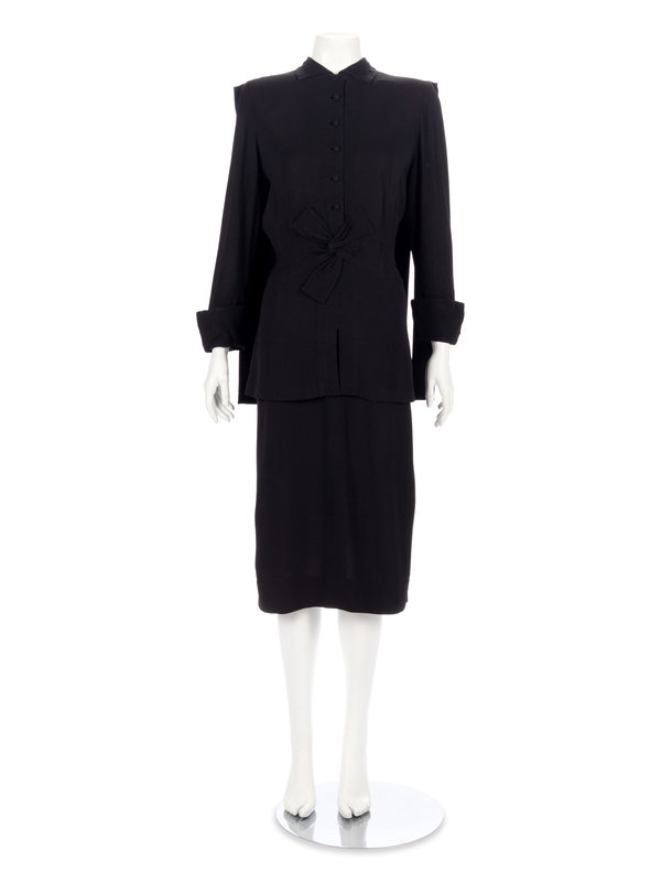 Black silk crepe long sleeve dress with roll collar, front waist knot detail with peplum over straight fit skirt, center front button closure, and back self fabric strip "cape".