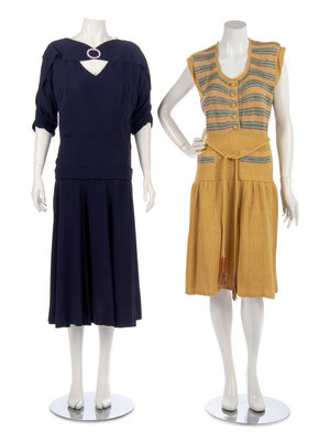 Navy drop waisted dress with draped neckline with rhinestone pendant, shirred short sleeves and flared skirt.