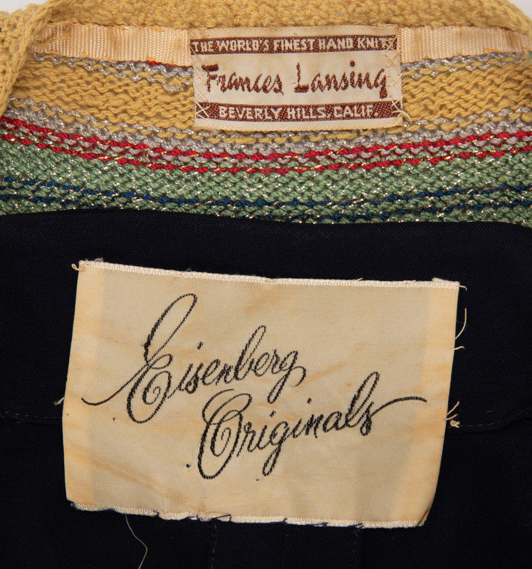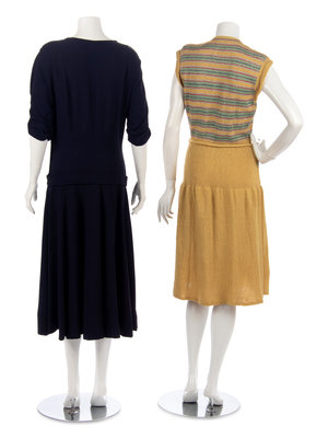 Yellow and variegated stripe rough-slub knit dress with front snap closure, tie cord belt, and hip pockets.
