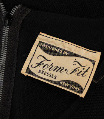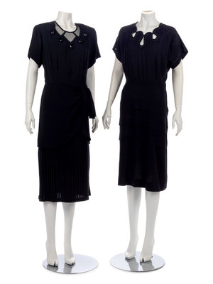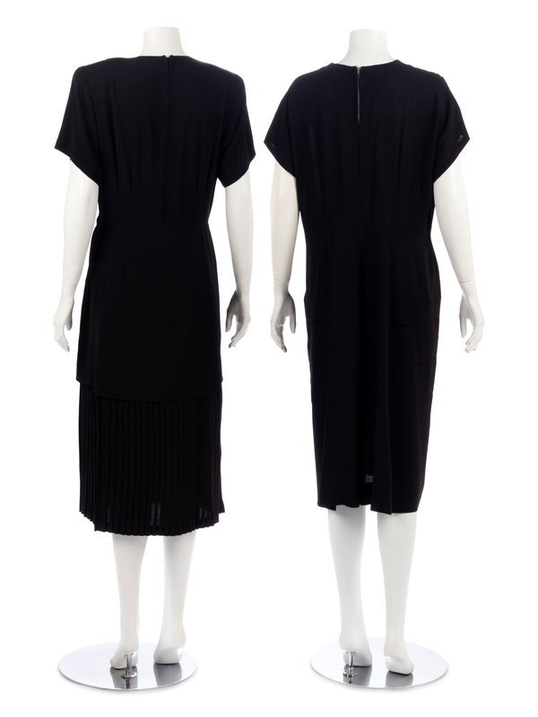 Black short sleeve dress with organza insert neckline with decorative faceted metal stones, sarong style peplum over knife pleated skirt, and zipper closures.