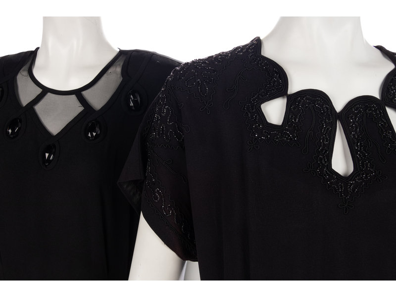 Black jersey short sleeve evening dress with black beaded embellishment detail at neckline and sleeve hems.