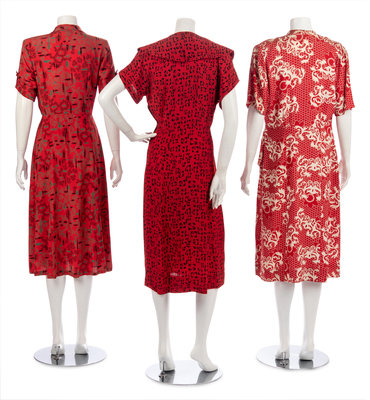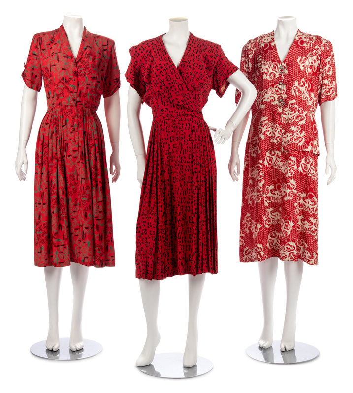 Red crepe wrap front dress with black square print, exaggerated lapel collar, and full pleated skirt.
