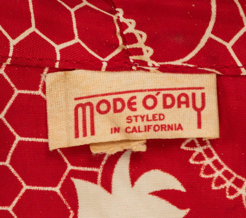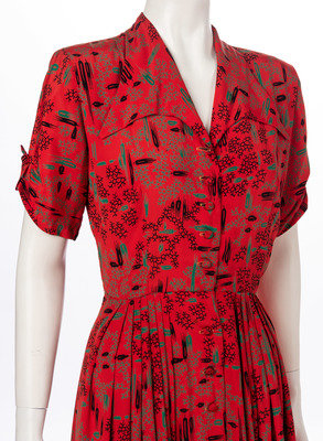 Red crepe de Chine short sleeve dress with black and green print, exaggerated pointed collar, front button closure and pleated flared skirt.