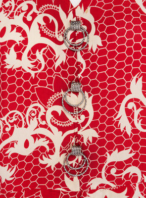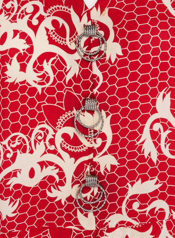 Red and off-white print satin-weave dress with shawl collar, short sleeves, front peplum over an a-line skirt, and silver-tone faceted metal rings down the center front.