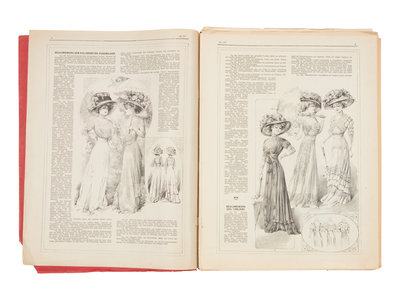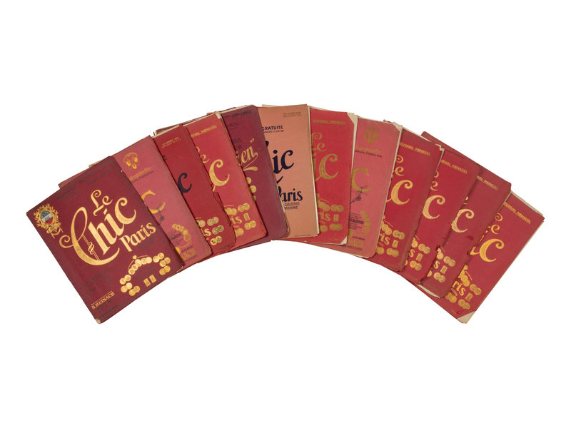 This lot includes 12 Le Chic Magazines. Each magazine has a red paper cover that is printed and embossed. On the inside are approximately twelve pages of text (in French and some also have English translations) and black and white illustrations featuring and describing the latest fashions. In each magazine, there are additional, full-page colorized illustrations, some of which have been further embellished with gold color that is raised from the surface of the paper. Some of the magazines contain double page 'center folds' filled with colorized illustrations of the latest styles.