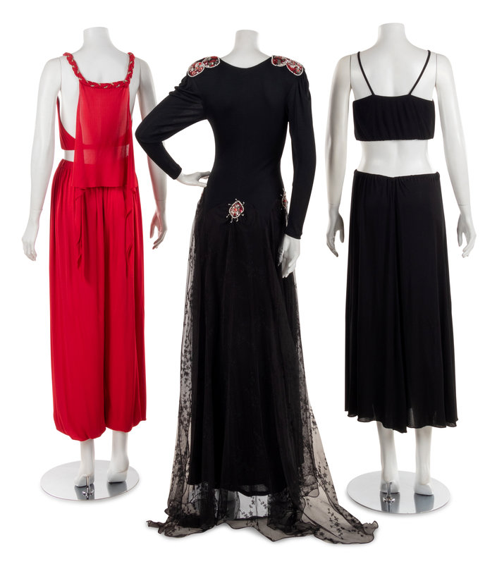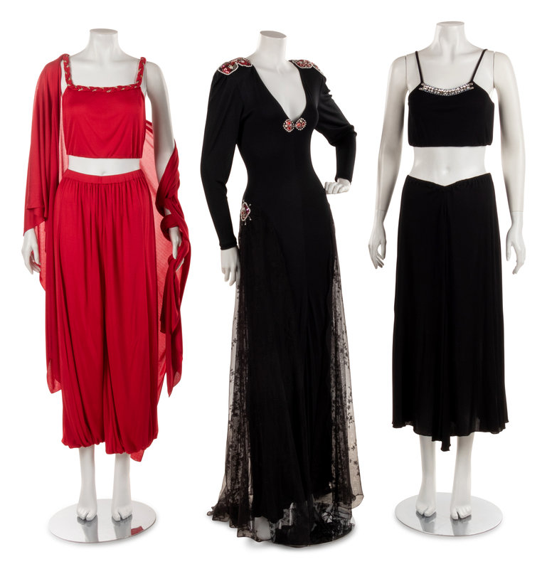 Black jersey crepe crop top with spaghetti straps, clear and light blue rhinestones and elasticized band; paired with matching flared skirt.