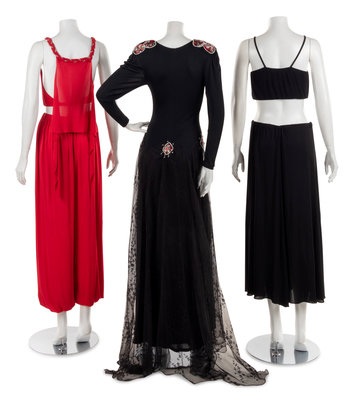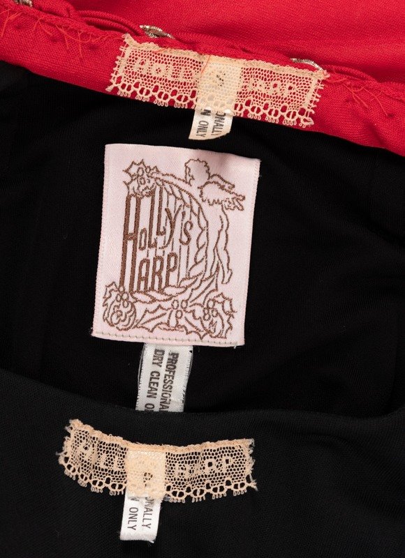 Black jersey knit long sleeve dress with red sequins, silver beads and faux pearl appliques, long full skirt, and gathered black lace panels at hips and center back.