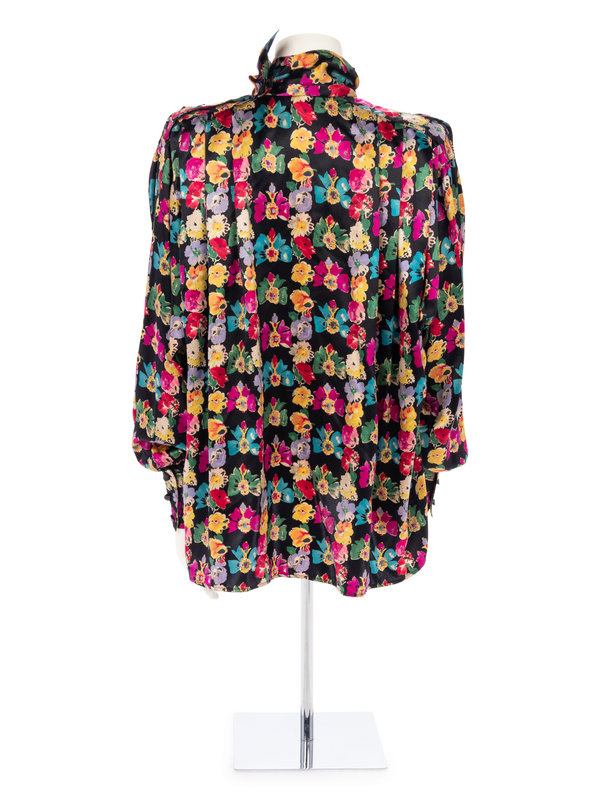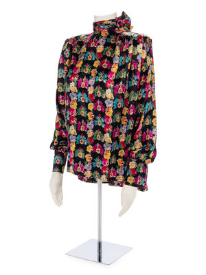 Black silk satin and jewel-tone floral print blouse with mock neck collar, tapered long sleeves and box cut bodice.