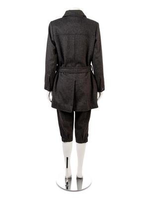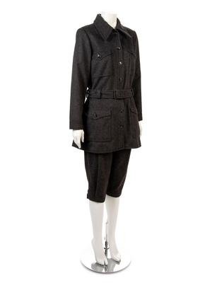 Two-piece gray wool and nylon ensemble of jacket and short pants. Top is made with a fold down collar, four patch pockets on the front, and self fabric belt. Pants made with pleat into waist line and hem, closes with center front hook and eye.