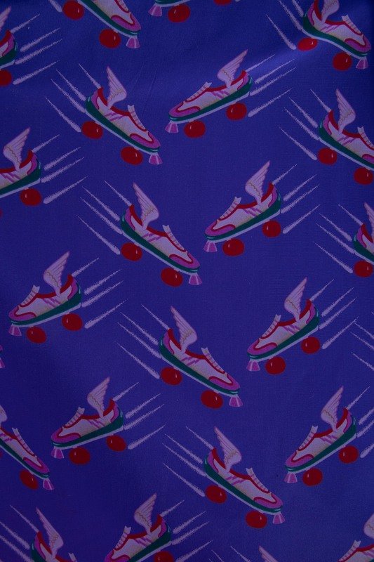 Blue crepe de Chine with flying roller skates print dress, bloused top, with leg-o-mutton 1/2 length sleeves, and full skirt trimmed in red.